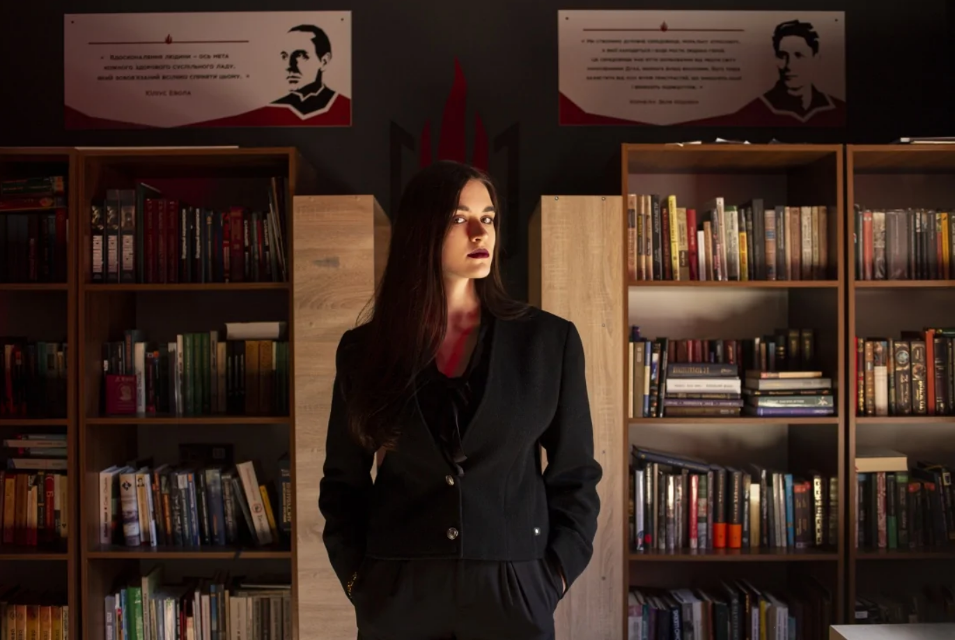 To give you a flavour of Plomin’s ideological leanings, the photo below is of Fedosiuk in 2020 in the organisation’s library at Cossack House. The posters on the wall behind her celebrate (left) Italian fascist intellectual Julius Evola and (right) the aforementioned Corneliu Codreanu. Plomin has published Ukrainian translations of writings by both of these notorious figures from the history of the European far right. “Azov as a whole is explicitly opposed to liberal democracy”, Colborne has pointed out. “The authors who influence them, who they openly wear on their sleeves, are ultranationalist, far-right and fascist.”
