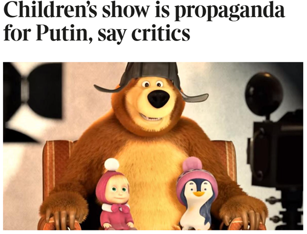 Unsurprisingly the Times article was subject to much derision. Leonid Ragozin tweeted that it reminded him of “Russian Duma wackos claiming that Harry Potter or Teletubbies are part of a grand conspiracy to corrupt Russian children”. In a blog post (“Masha and the Bear are not coming to invade your homeland”) Mark Galeotti described the article as “peak cliché Russophobia”. It turned out he was mistaken, though — there were yet further heights to be scaled in the incitement of Russophobic hysteria over the cartoon.