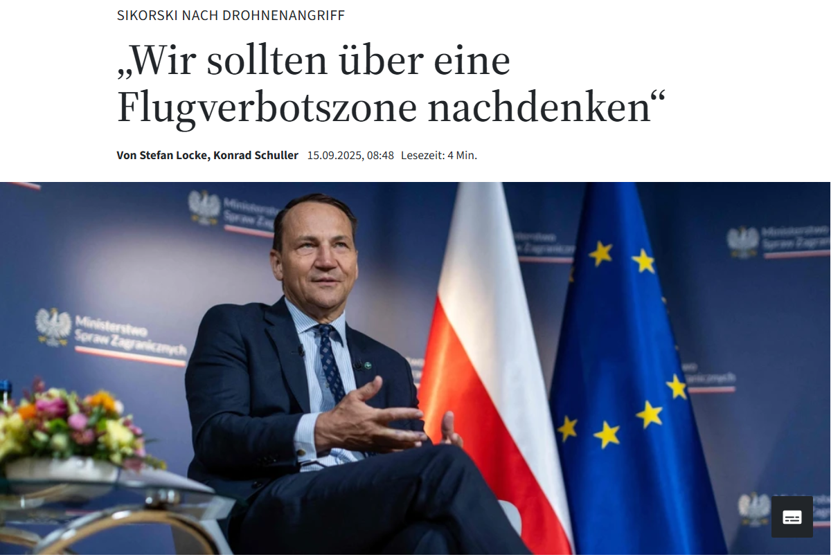 In an interview with the Frankfurter Allgemeine Zeitung, Sikorski was asked about calls by Zelensky’s chief of staff Andriy Yermak for NATO to impose a no-fly zone over Ukraine. He replied that the protection of Poland’s population “would of course be greater if we could combat drones and other flying objects beyond our national territory. If Ukraine were to ask us to shoot them down over its territory, that would be beneficial for us. If you ask me personally: We should consider it.” As Dmitry Medvedev of Russia’s security council pointed out in response, the adoption of such a policy would “mean only one thing — a war between NATO and Russia”.