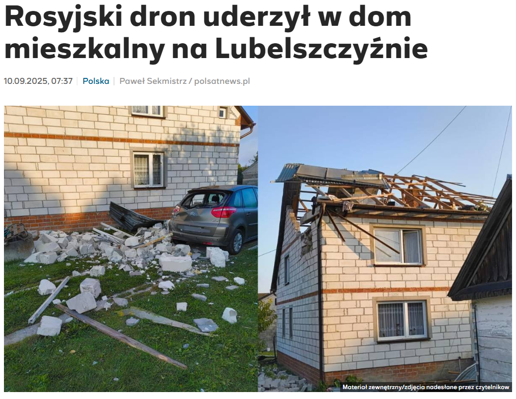 One of the highly publicised results of the 9–10 September drone incursion was the severe damage caused to a house in the Polish village of Wyryki-Wola. On 12 September, in his speech to the UN Security Council, Poland’s secretary of state Martin Botaski brandished a photo of the wrecked house as evidence that Russia had “tried to target Polish homes”.